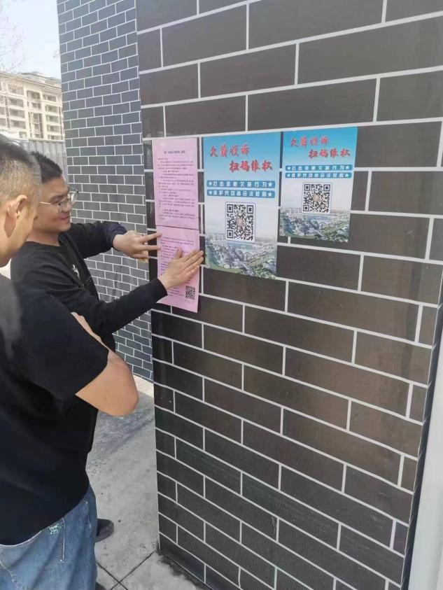 圖為用工現場工作人員張貼掃碼維權明白紙和致廣大農民工朋友的一封信。