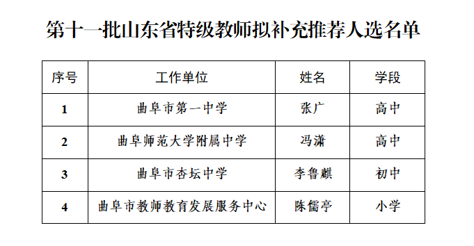 按照濟寧市教育局《關于開展第十一批山東省特級教師推薦工作的通知》(濟教函〔2024〕15號)要求,經個人申報、學校推薦、評委會評選,擬補充推薦張廣等4名同志為第十一批山東省特級教師推薦人選,名單附后,現予公示,公示期至2024年3月5日。如對人選有異議,請于公示期內到市教育和體育局人事科查詢反映。