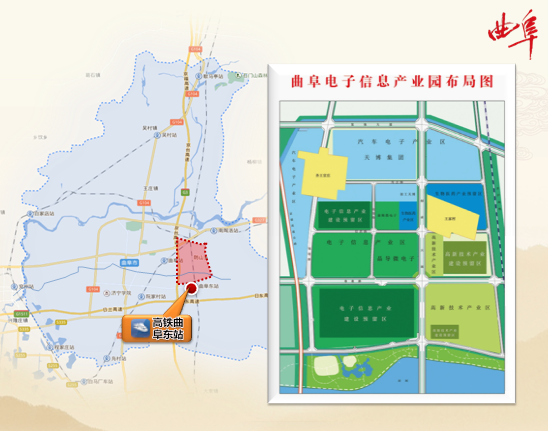 電子信息產業園位于曲阜城區東部,毗鄰高鐵曲阜東站,總規劃面積145.75公頃。主要招引汽車電子、晶圓生產、集成電路設計、封裝測試及電子元器件制造等相關企業。