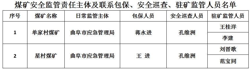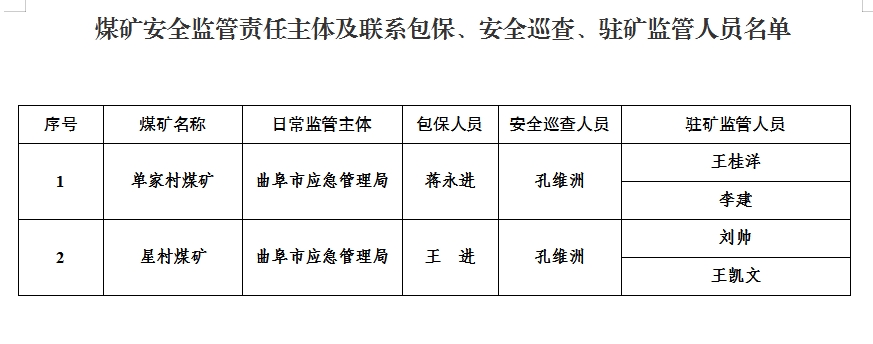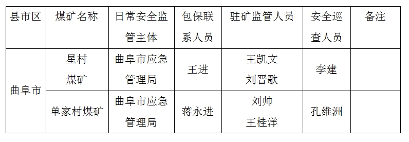 附件1:曲阜市轄區煤礦安全監管責任主體及聯系包保、安全巡查、駐礦監管人員名單