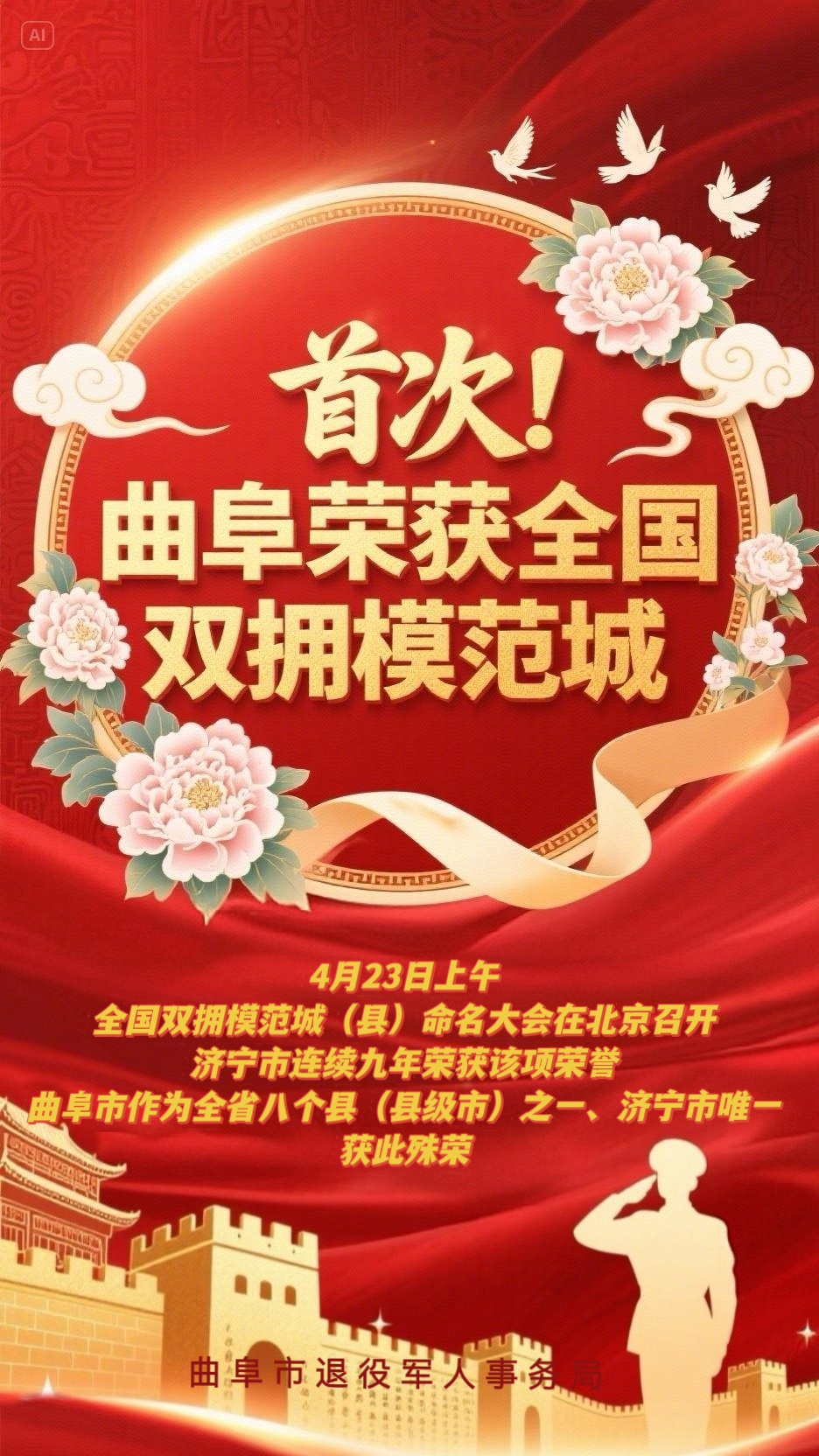 4月23日上午,全國雙擁模范城(縣)命名大會在北京召開。濟寧市連續九年榮獲該項榮譽。曲阜作為全省八個縣(縣級市)之一、濟寧市唯一,獲此殊榮。
