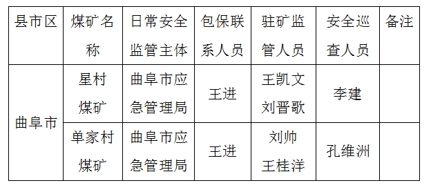 關于曲阜市轄區煤礦安全監管責任主體及聯系包保、安全巡查、駐礦監管等有關情況的公告