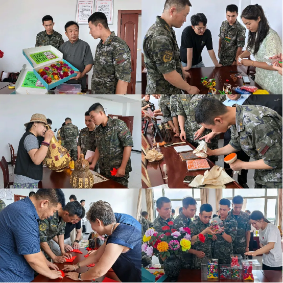在非遺展示區(qū),絹花、剪紙、面塑、拓片、雕刻葫蘆等非遺傳承人現(xiàn)場(chǎng)演示精湛技藝,并手把手指導(dǎo)官兵們體驗(yàn)制作。戰(zhàn)士們興致勃勃,在互動(dòng)中感受傳統(tǒng)文化的獨(dú)特魅力,優(yōu)秀作品作為紀(jì)念贈(zèng)予官兵,成為軍民情誼的珍貴見(jiàn)證。