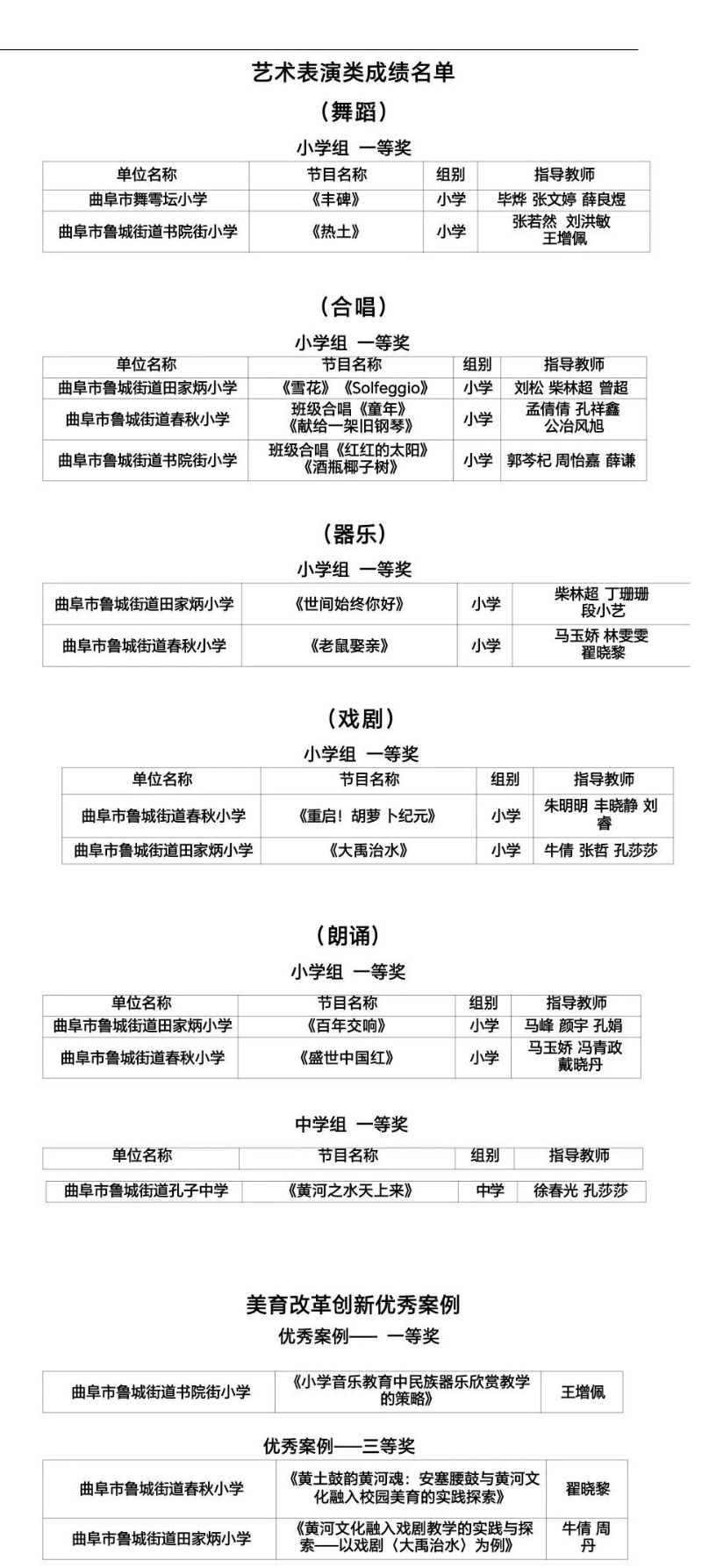 近日,濟寧市教育局公布濟寧市第十三屆學(xué)校藝術(shù)節(jié)比賽獲獎情況,曲阜市魯城街道中心中學(xué)推送的表演類12個節(jié)目全部榮獲一等獎,中小學(xué)美育改革創(chuàng)新優(yōu)秀成果作品獲一等獎1個,三等獎2個,獲獎等次與數(shù)量均創(chuàng)歷史新高,充分展示了魯城街道美育教育的豐碩成果。
