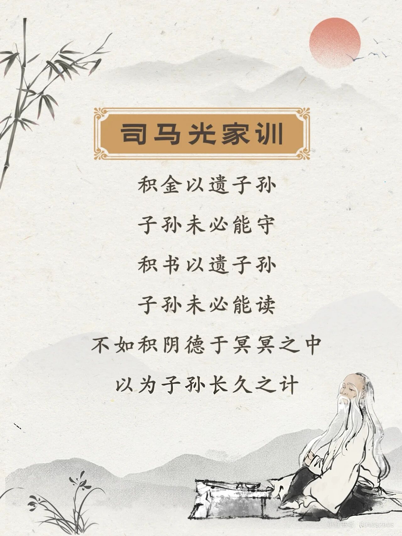 以德貽世。司馬光提出遺德不遺財的治家理念,他在《家范》中強調“昔者圣人遺子孫以德以禮,賢人遺子孫以廉以儉”。在他看來,比起多積錢財給子孫,傳承高尚品德與端正家風更為重要,通過培養子孫自立自強的品格,才能使家族長久興盛。當宋英宗將宋仁宗價值百余萬的遺物賞賜群臣時,司馬光率領同僚3次上書勸諫,最終“以所得珠為諫院公使錢,金以遣舅氏”,自己分文未取。他還以歷史為鏡,在《家范》中引用楊震“使后世稱為清白吏子孫,以此遺之,不亦厚乎”的訓言,彰顯德行傳承的厚重價值;同時詳述西漢大臣疏廣散金的典故,及其“賢而多財則損其志,愚而多財則益其過”的深刻見解,闡明遺德遠比遺財更能護佑家族長久。